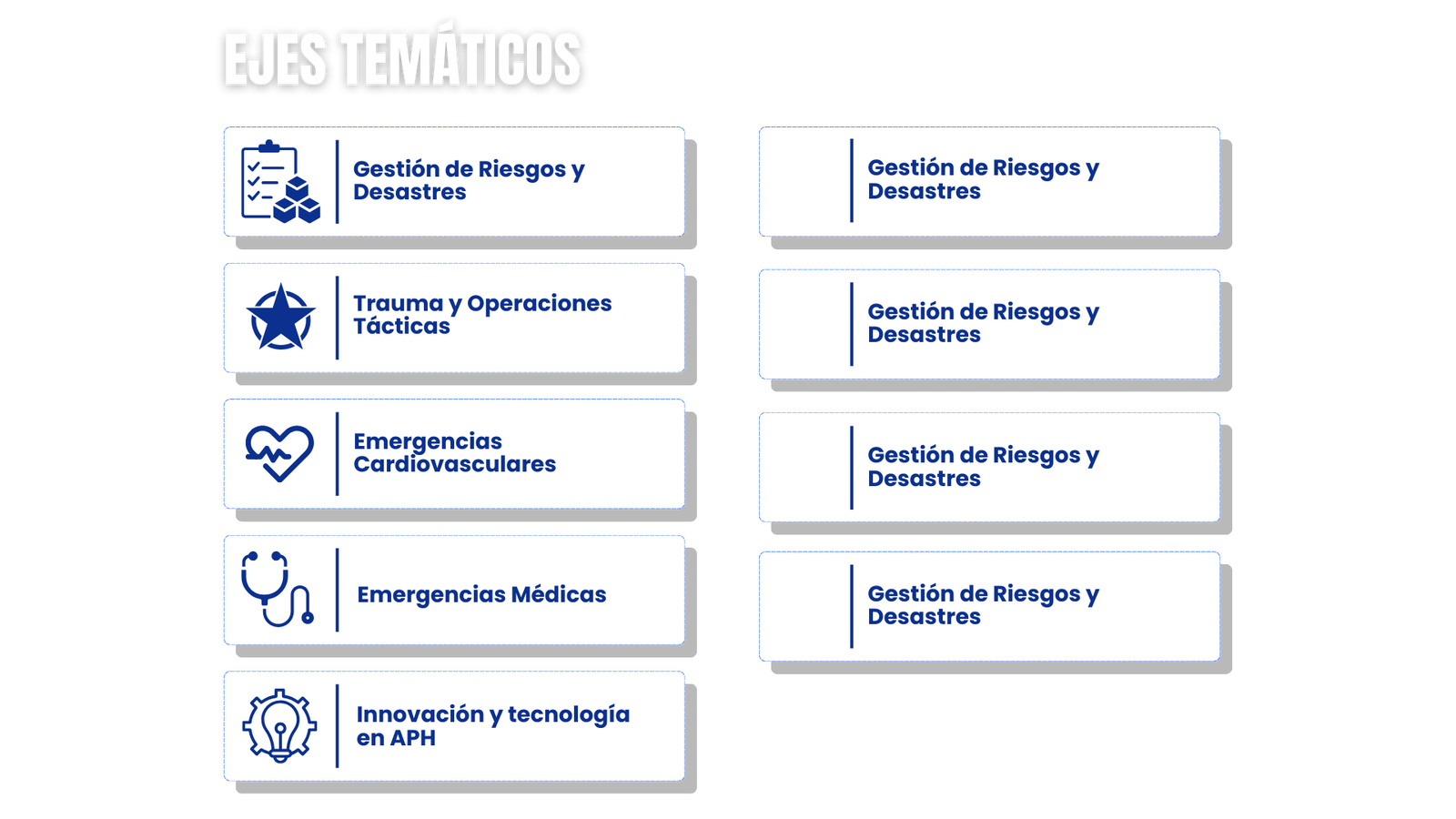 El congreso tiene como objetivo actualizar y fortalecer las capacidades técnicas y operativas de los profesionales de emergencias prehospitalarias, abordando estrategias de atención del paciente crítico, respuesta ante incidentes complejos, innovación tecnológica y buenas prácticas que contribuyan al fortalecimiento de los sistemas de emergencia en la región.